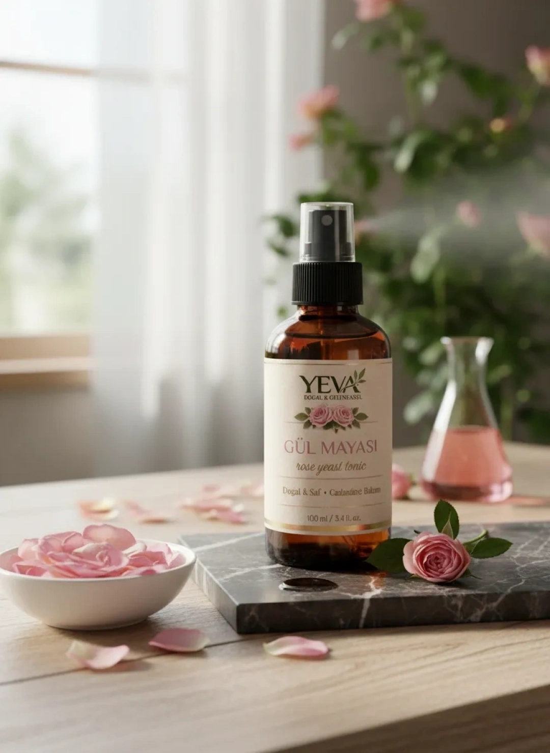 YEVA KOZMETİK'in %100 doğal ve saf Gül Mayası, cildiniz için mükemmel bir yenileyici toniktir. Gül mayası, cildi derinlemesine temizler ve tazeler, aynı zamanda ferahlatıcı bir etkiye sahiptir.